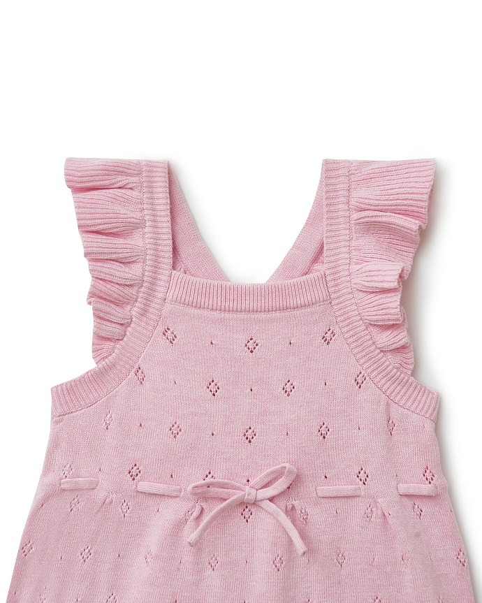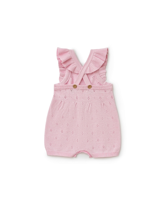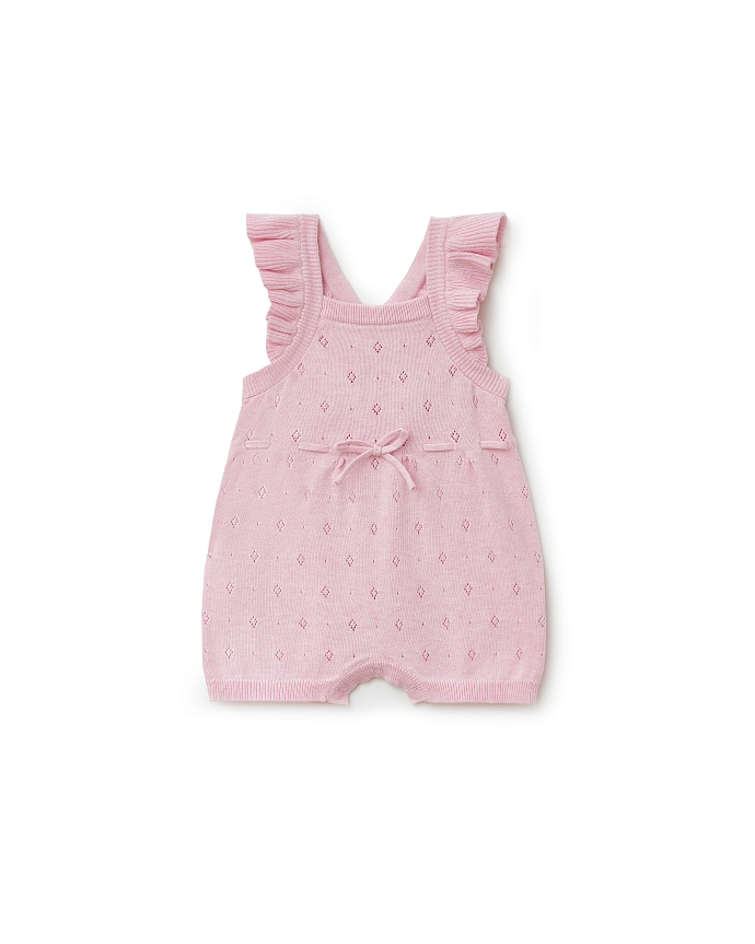 Трикотажный легкий комбинезон на бретелях с шортиками фасона "фонарик" из новой коллекции Babybu – писк будущего сезона. Его нежный розовый цвет и ажурный рисунок смотрится свежо и нарядно. Завязки на поясе деликатно обеспечивают идеальную посадку.