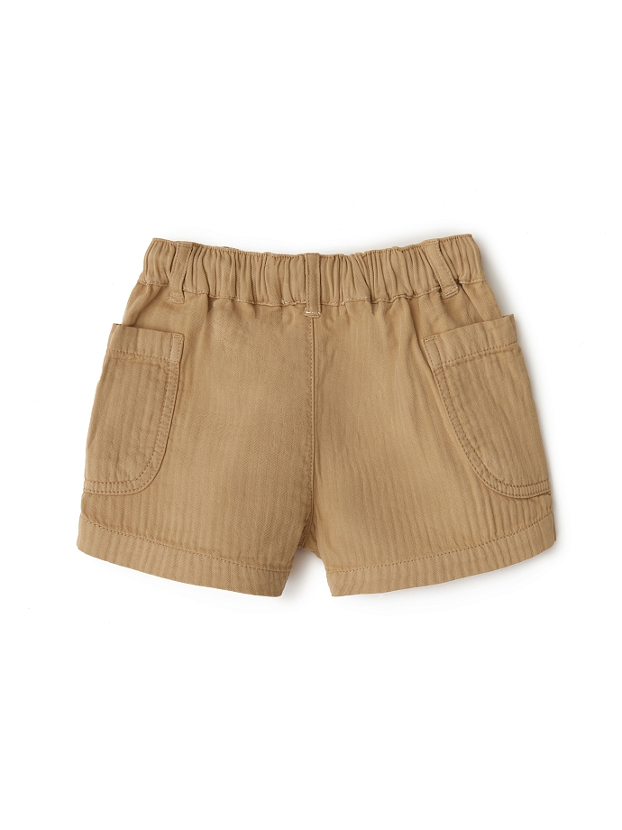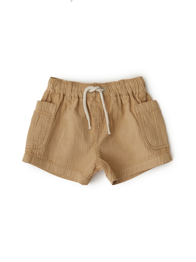 Шорты песочного цвета средней длины – отличная одежда на теплый период. Полнота регулируется ярко-белыми завязками на поясе, которые надежно фиксируют посадку шорт и одновременно их украшают. Контрастные завязки прекрасно смотрятся на более темном фоне. Два больших накладных кармана по бокам тоже делают шорты визуально интереснее. Ткань легкая и «дышащая».